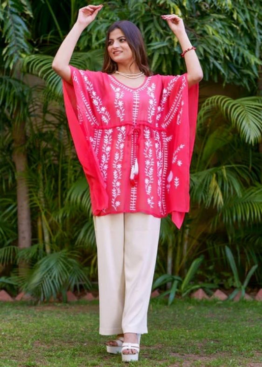 Red Short Georgette Kaftan With Aari Embroidery