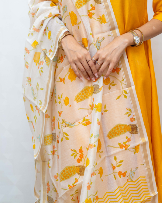 White Yellow Printed Chanderi Silk Cotton Dupatta