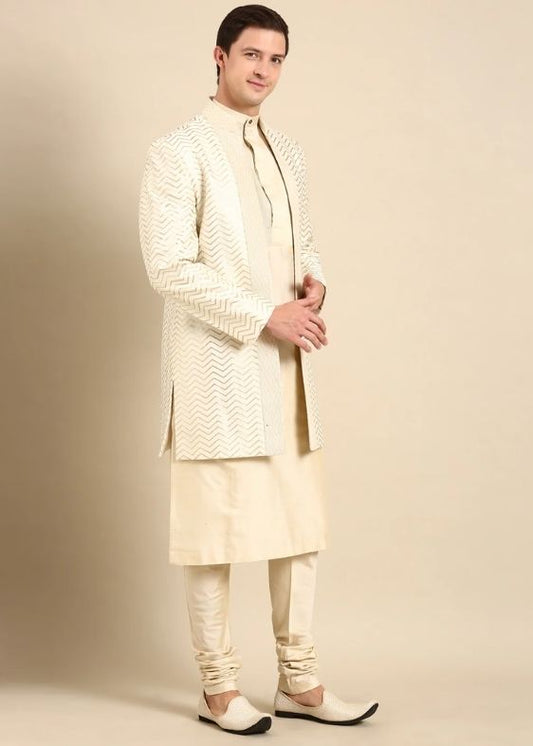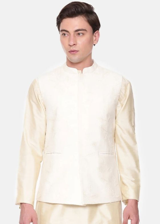 Ivory Beige Silk Jacquard Kurta Set - MMK0597