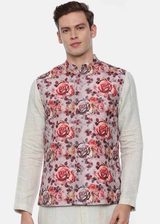 Pink Printed Linen Nehru Jacket - MMWC0174