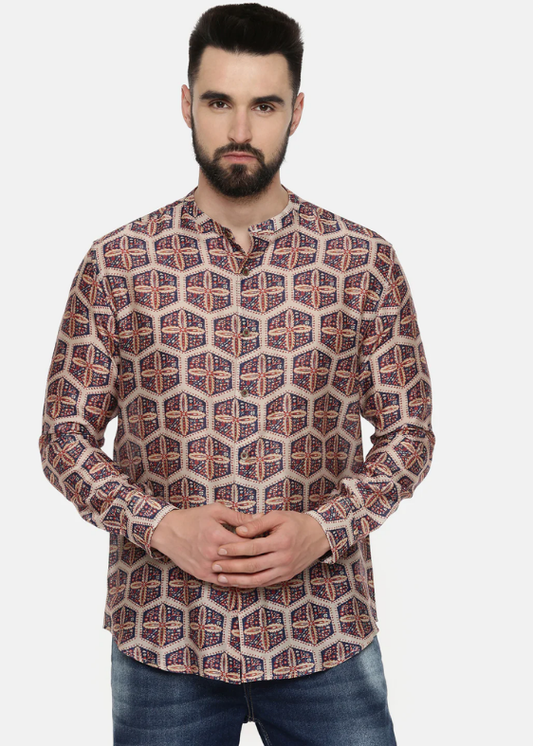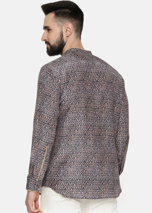 Linen Bemberg Blue Beige Pirnted Shirt