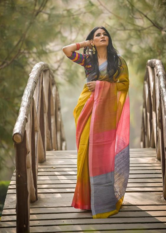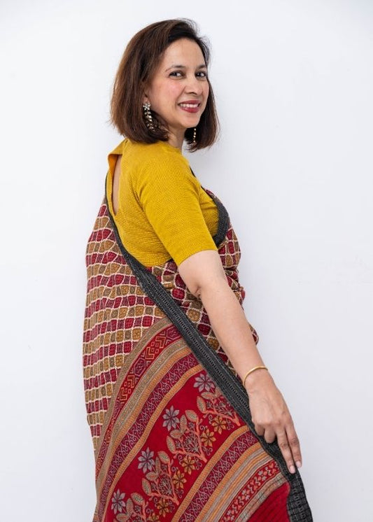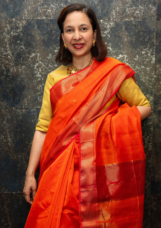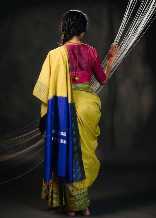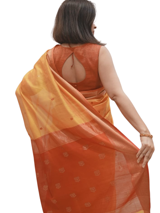 Yellow Red Gold Boota Maheswari Silk Cotton Puja Saree