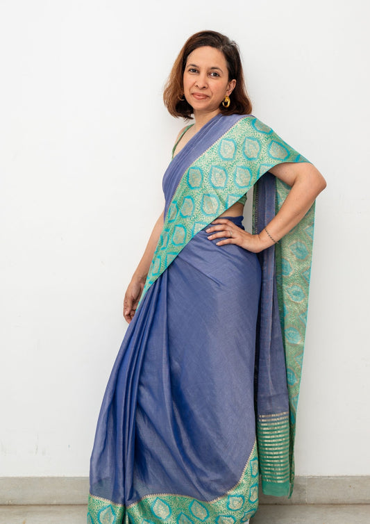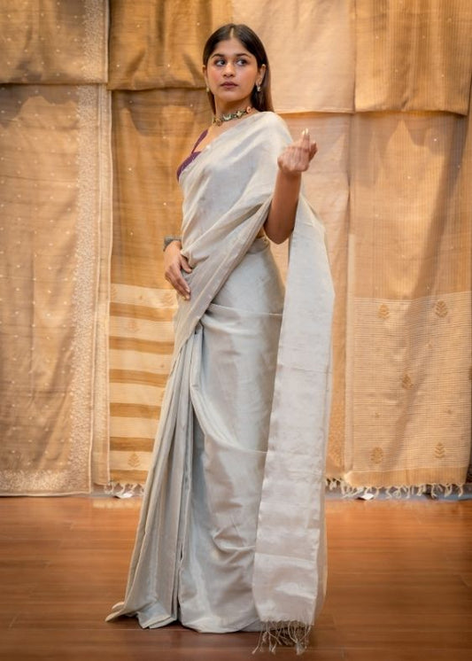 Blue Grey Red Border Assam Silk Saree Jamdani Booti