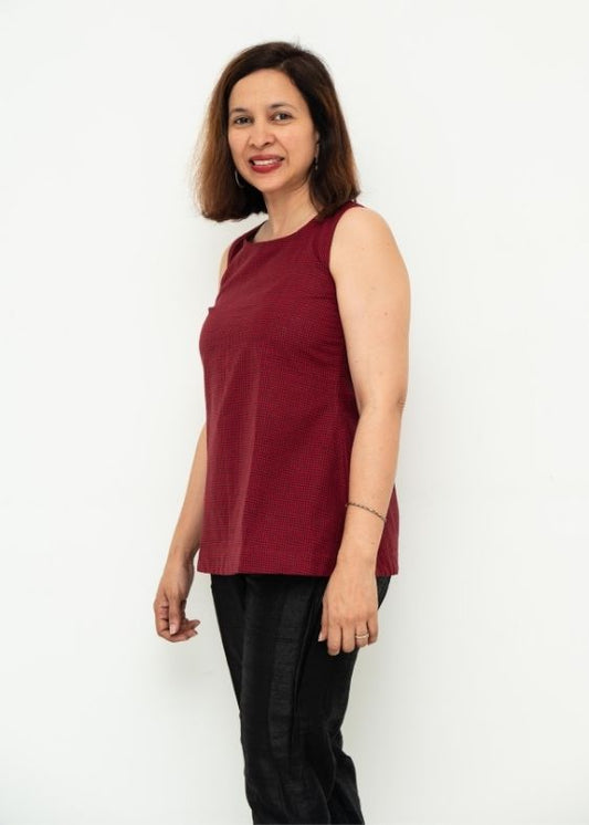 Red Deepam Neck Silk Tissue Sleeveless Blouse