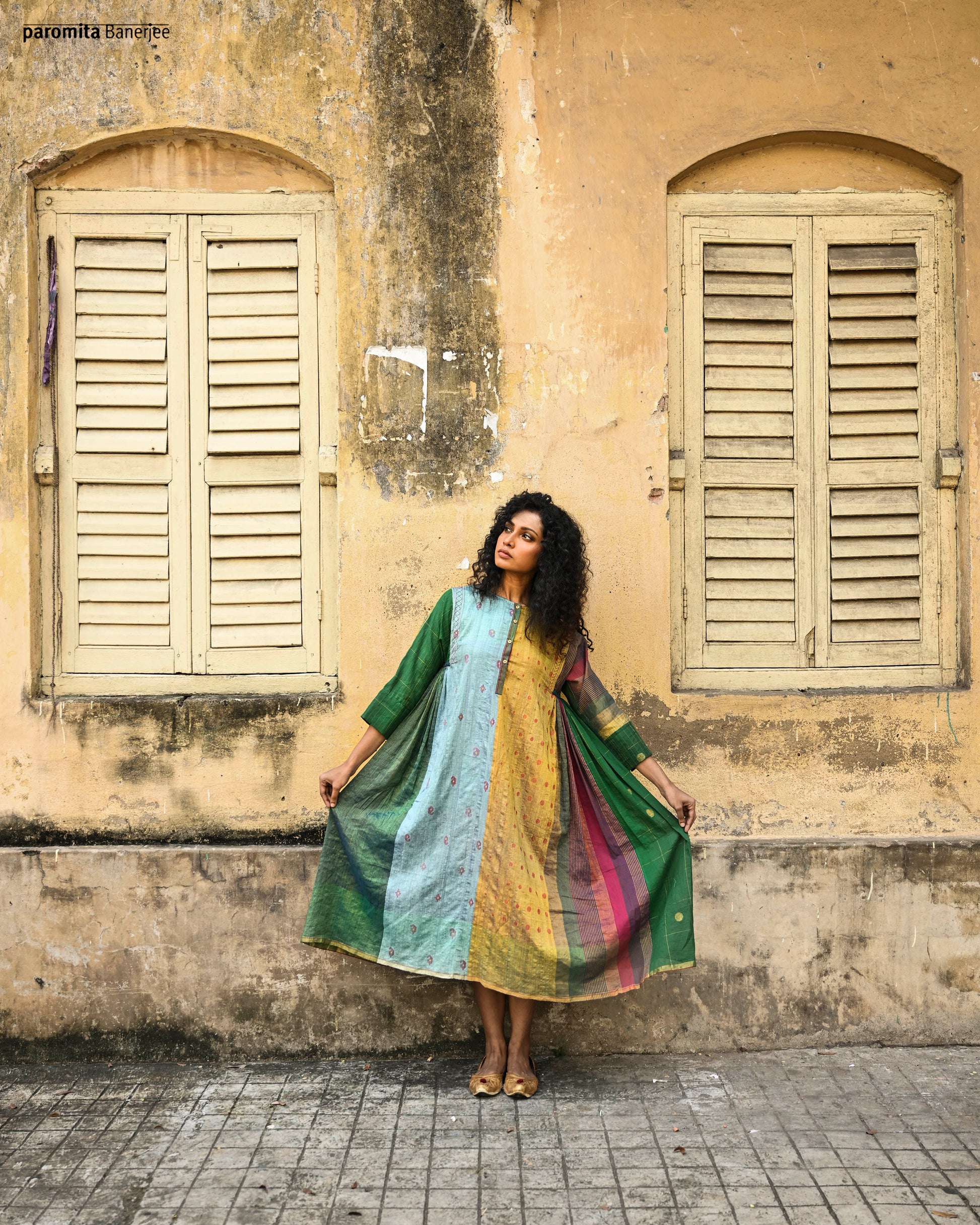 BAGAN Anokhi dress in handwoven silk matka and colour blocks with clusters of jamdani motif. Hand beaten brass buttons. Hand finished neckline.