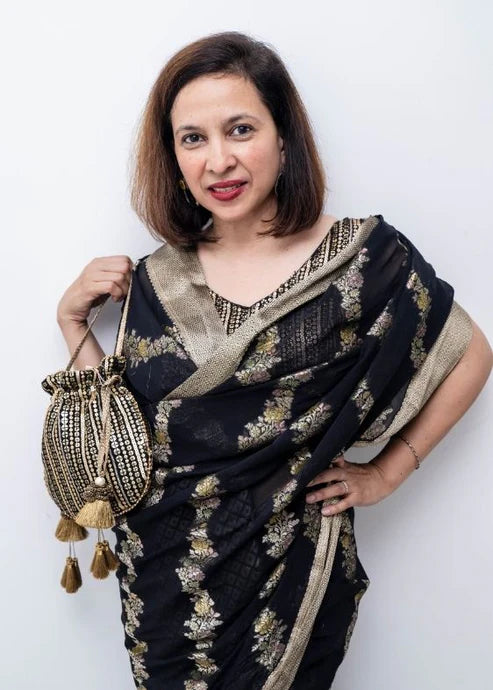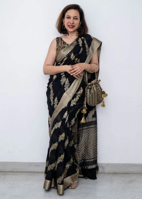 Black Gold Diagonal Flowers Georgette Silk Saree