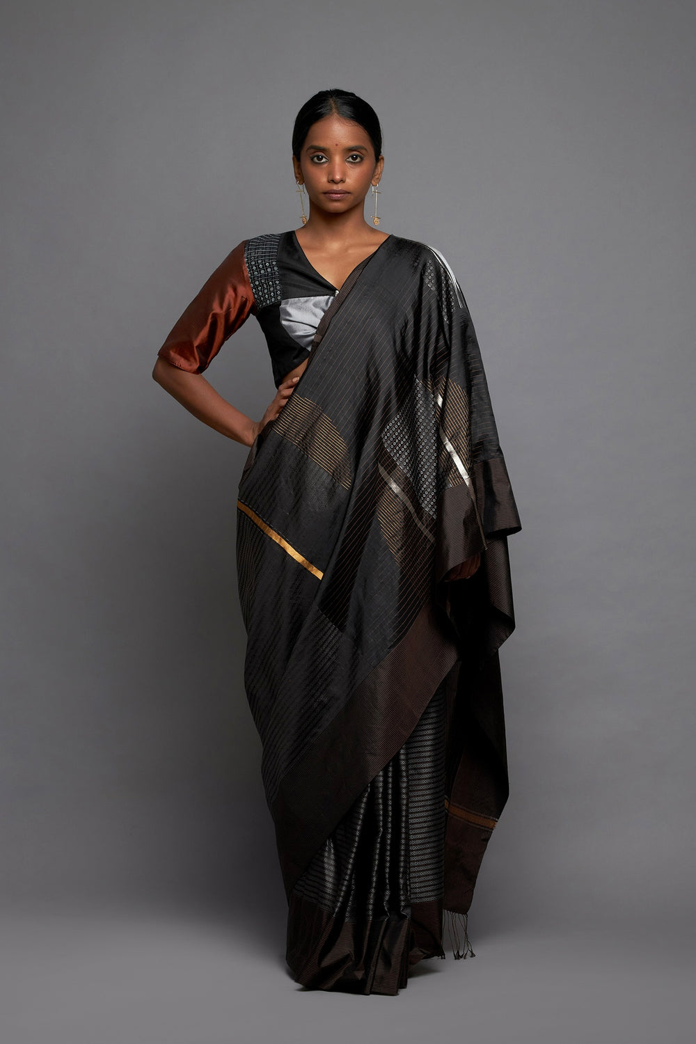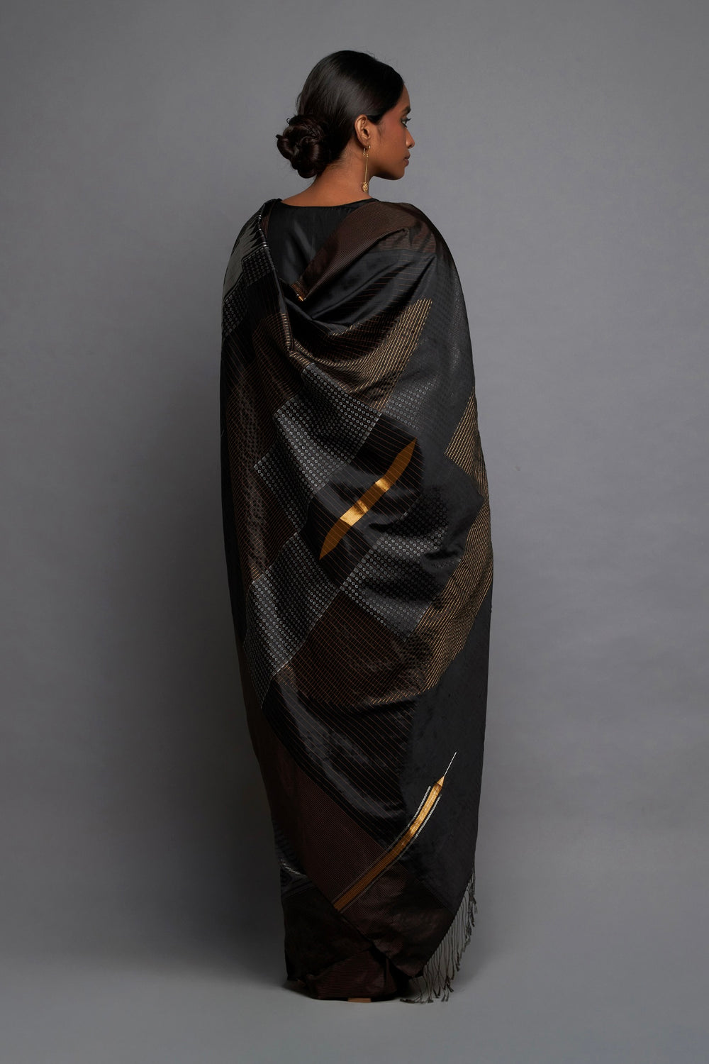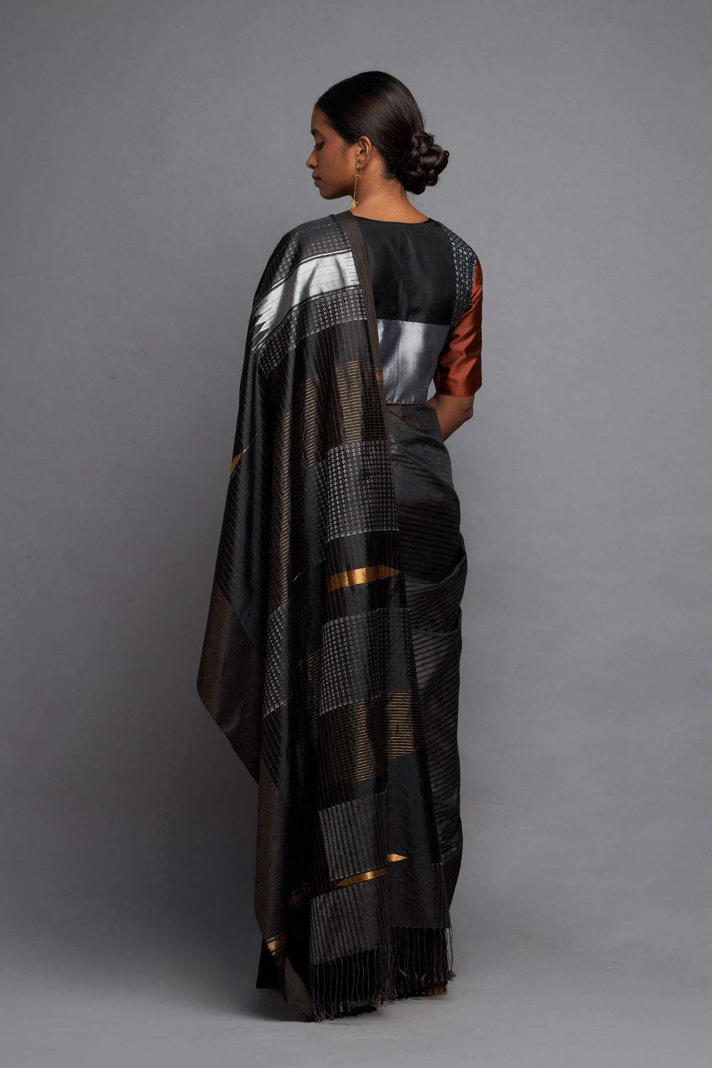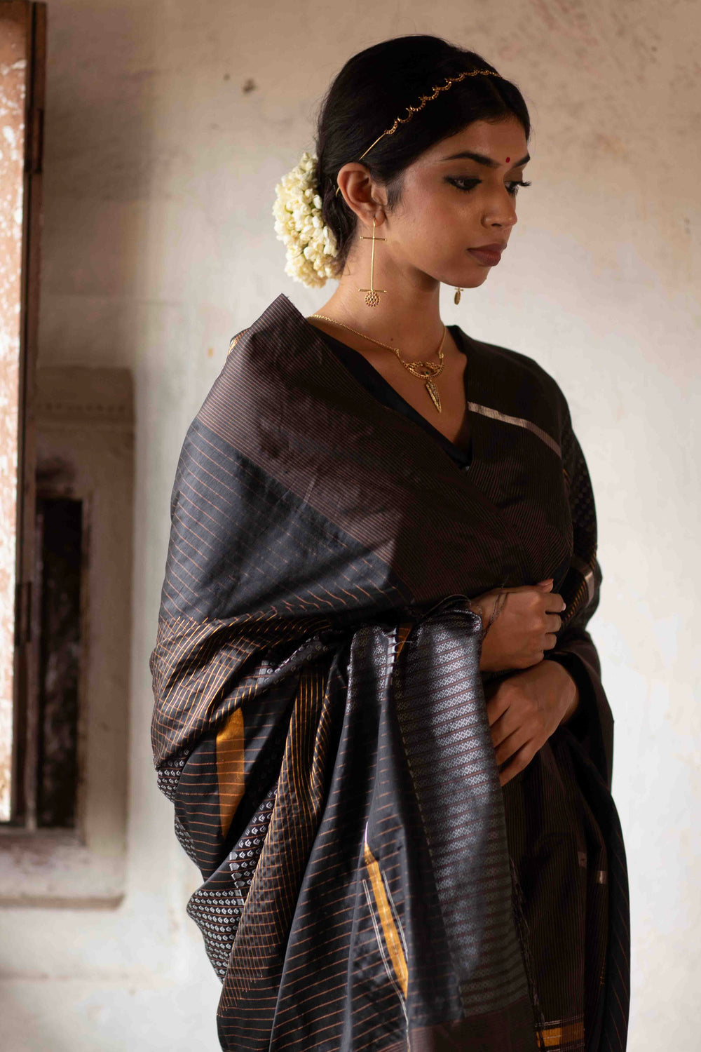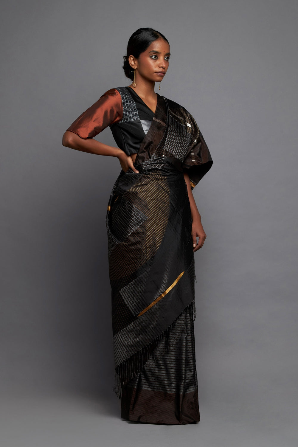 This exquisite kappu khana saree brings together the Khana and Ilkal elements on a black ground with dramatic silver and copper zari in a geometric pattern creating the most elegant drape. Reimagined khana and Ilkal woven in northern Karnataka.