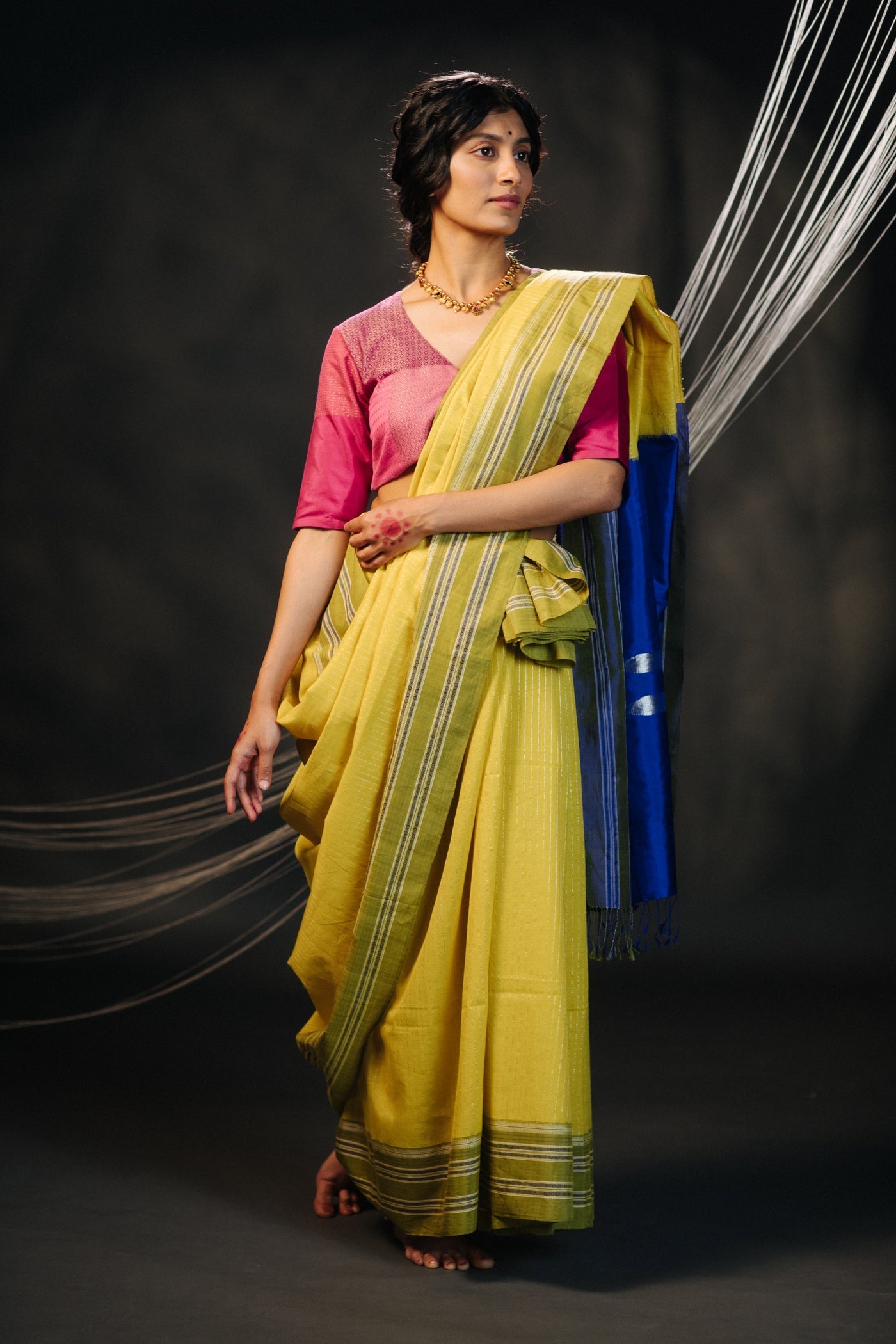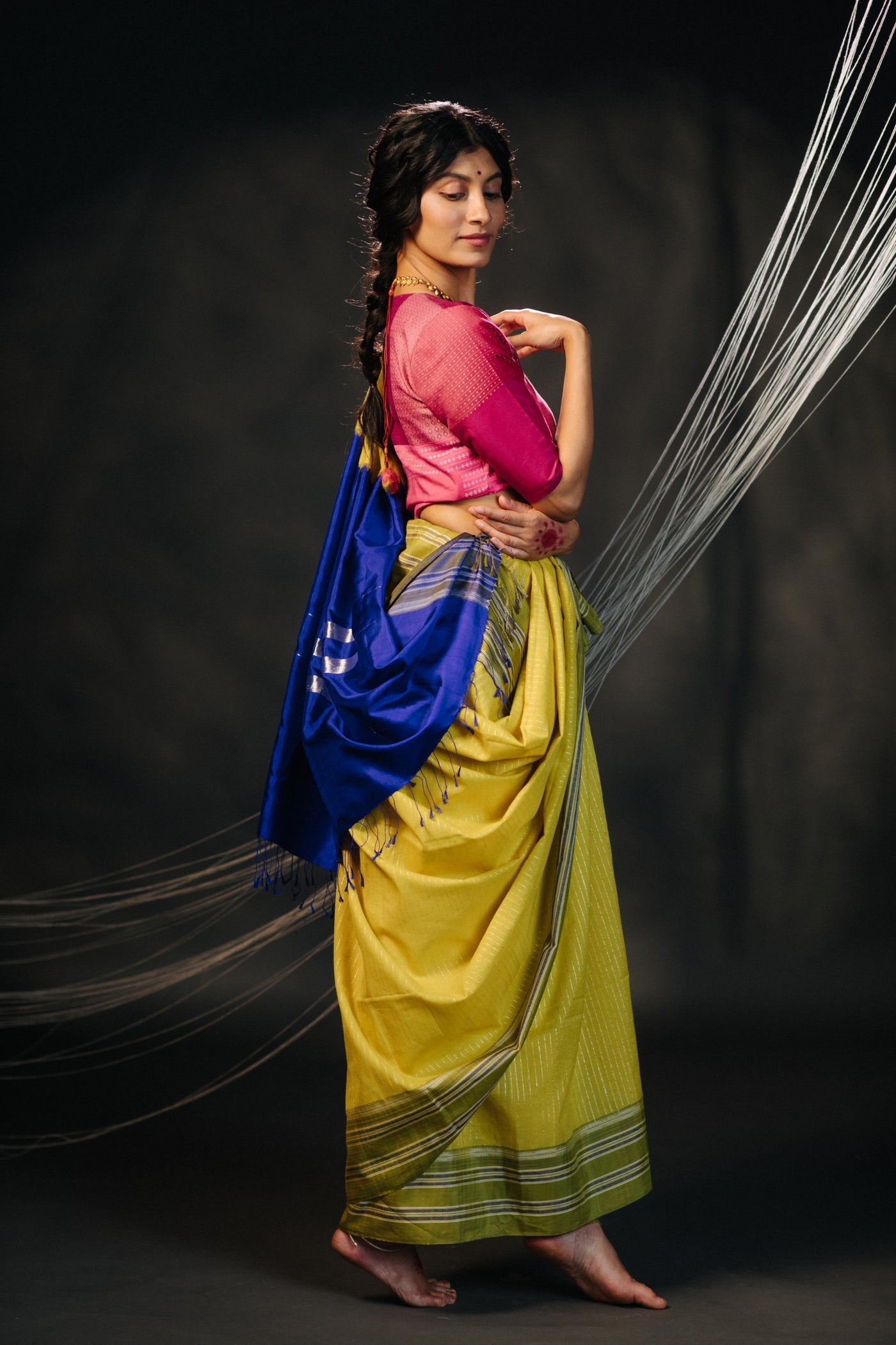 This exquisite kappu khana saree brings together the Khana and Ilkal elements on a black ground with dramatic silver and copper zari in a geometric pattern creating the most elegant drape. Reimagined khana and Ilkal woven in northern Karnataka.