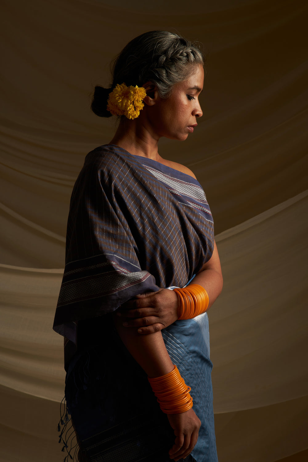 Parvatha ilkal saree features a blue and a brown striped cotton body accentuated with fine silver zari tirukis and blue traditional chikki paras border. The gleaming blue silk pallu is woven with topteni motif in silver zari using three shuttle weaving technique.