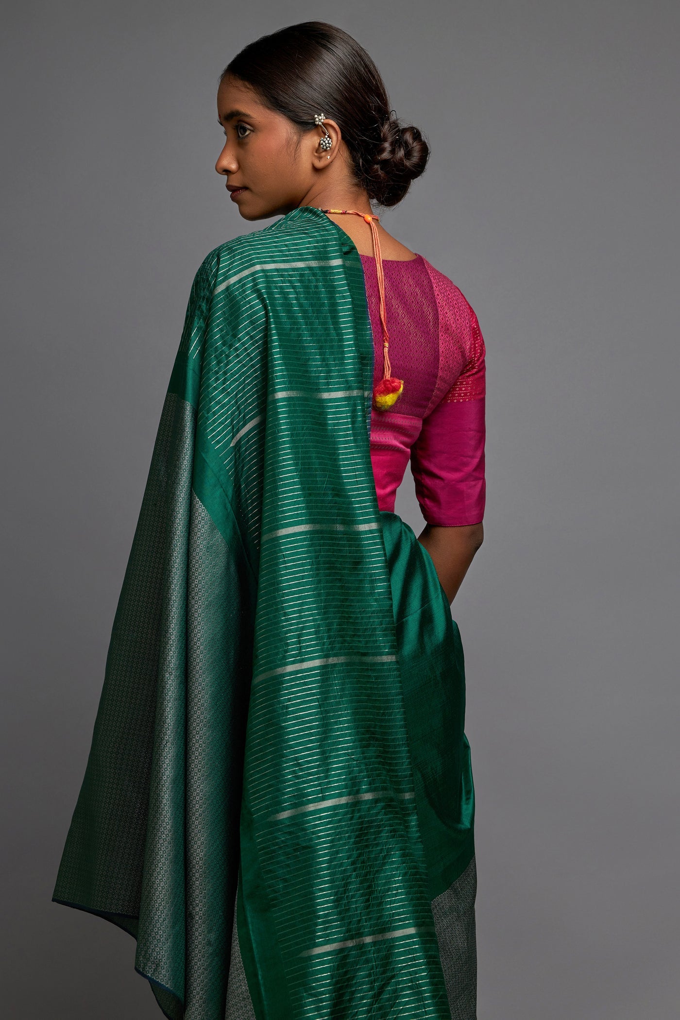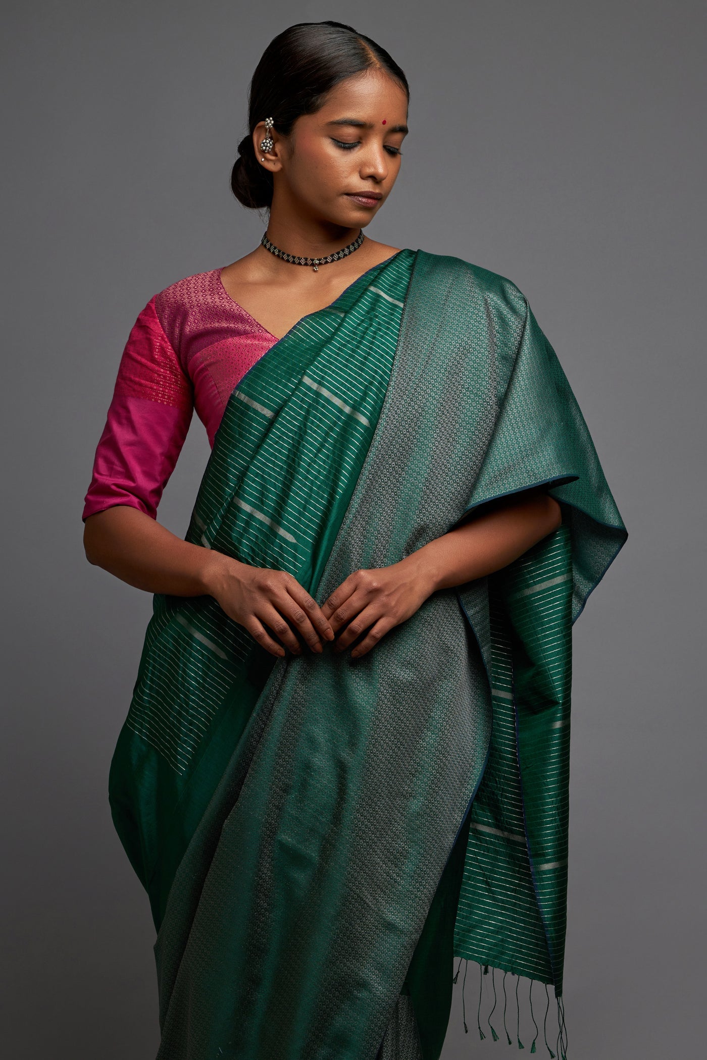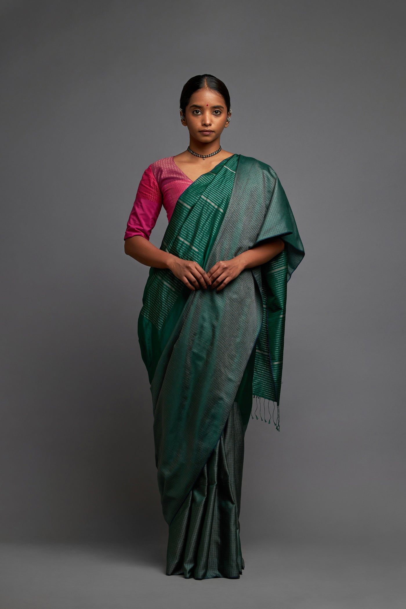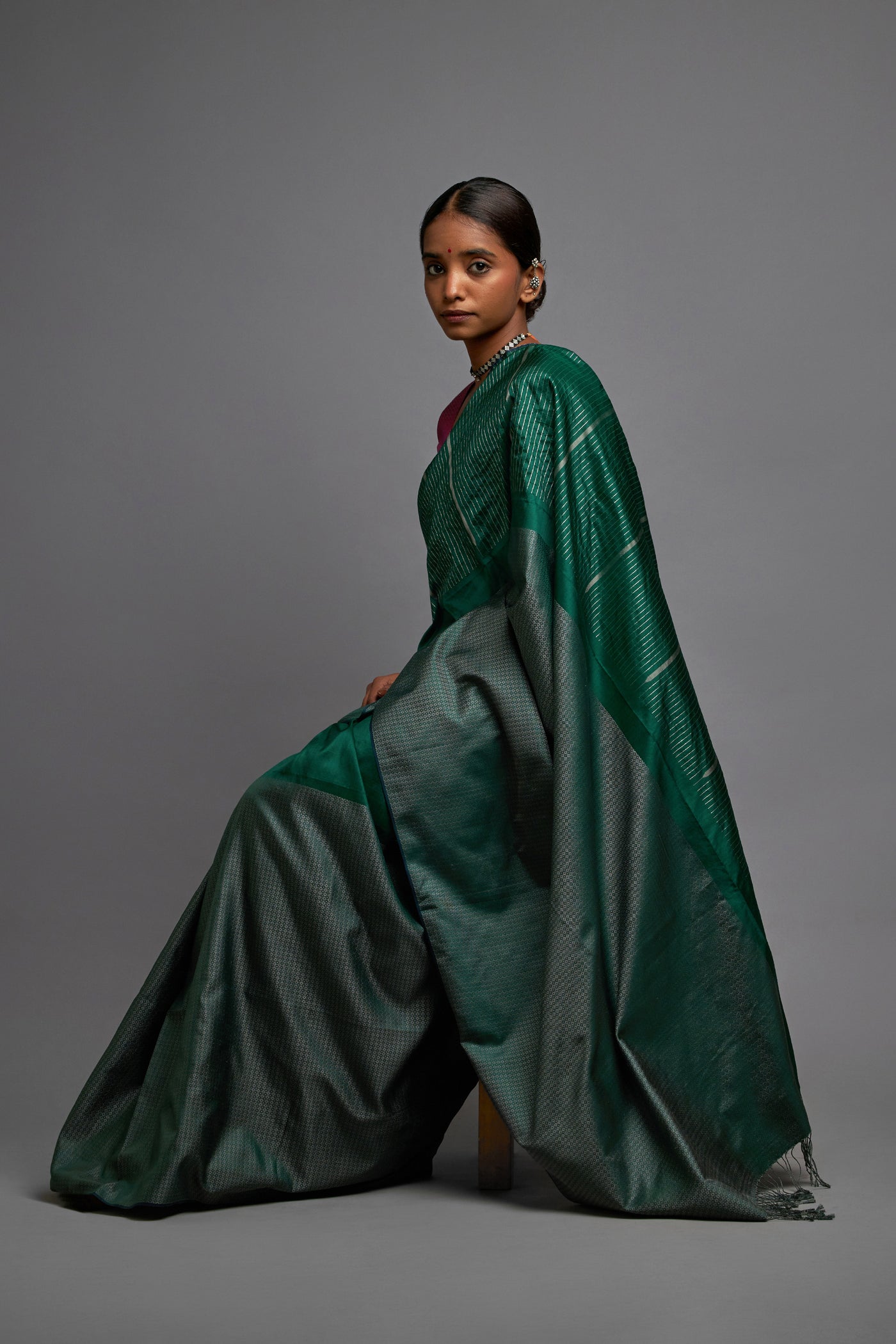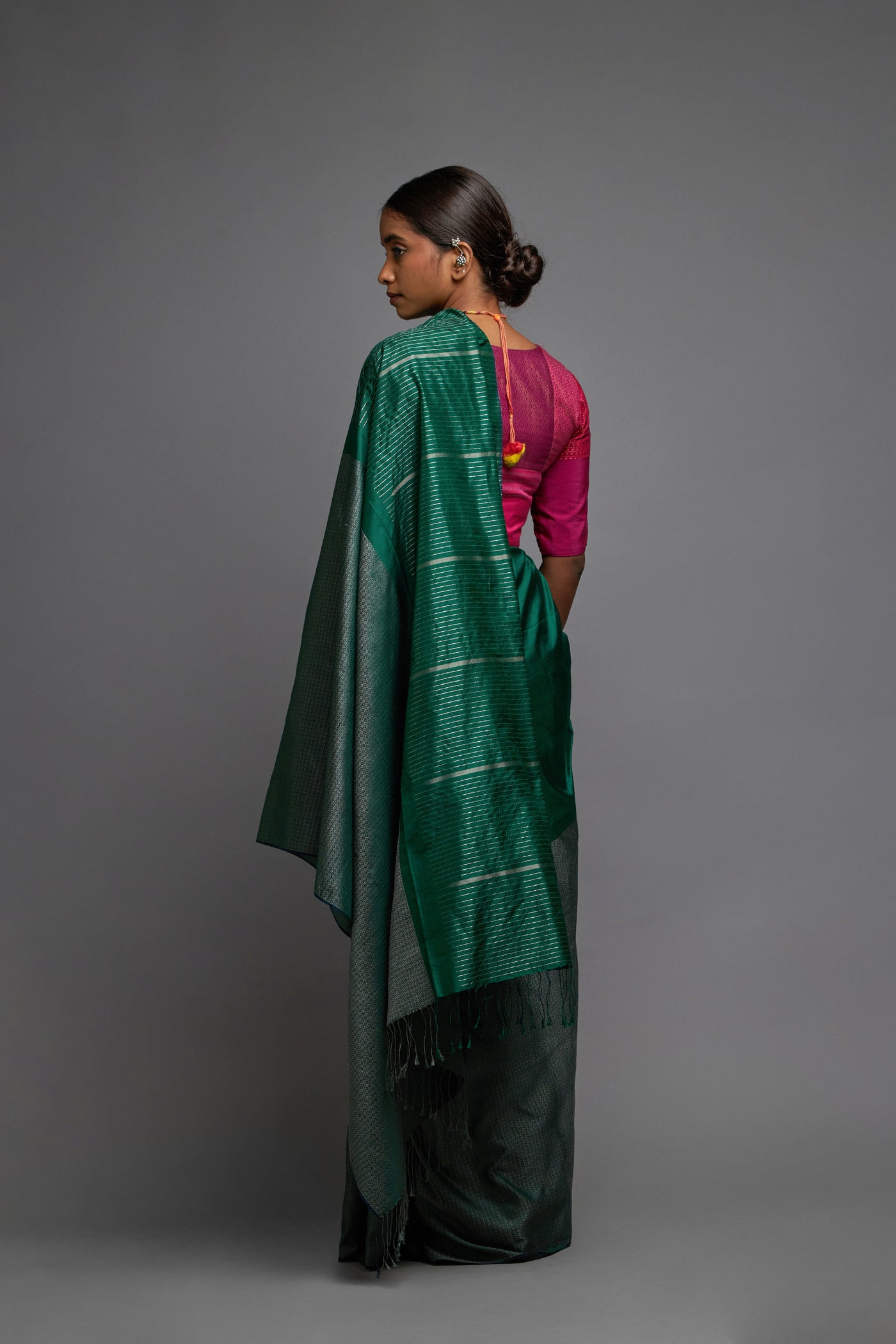 This exquisite kappu khana saree brings together the Khana and Ilkal elements on a black ground with dramatic silver and copper zari in a geometric pattern creating the most elegant drape. Reimagined khana and Ilkal woven in northern Karnataka.