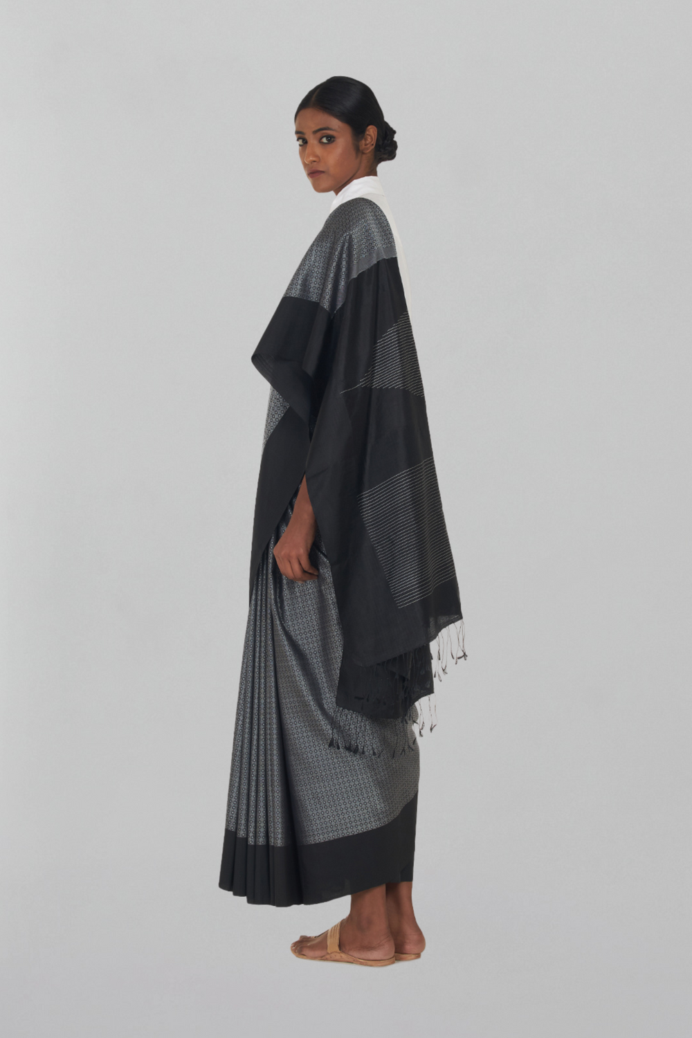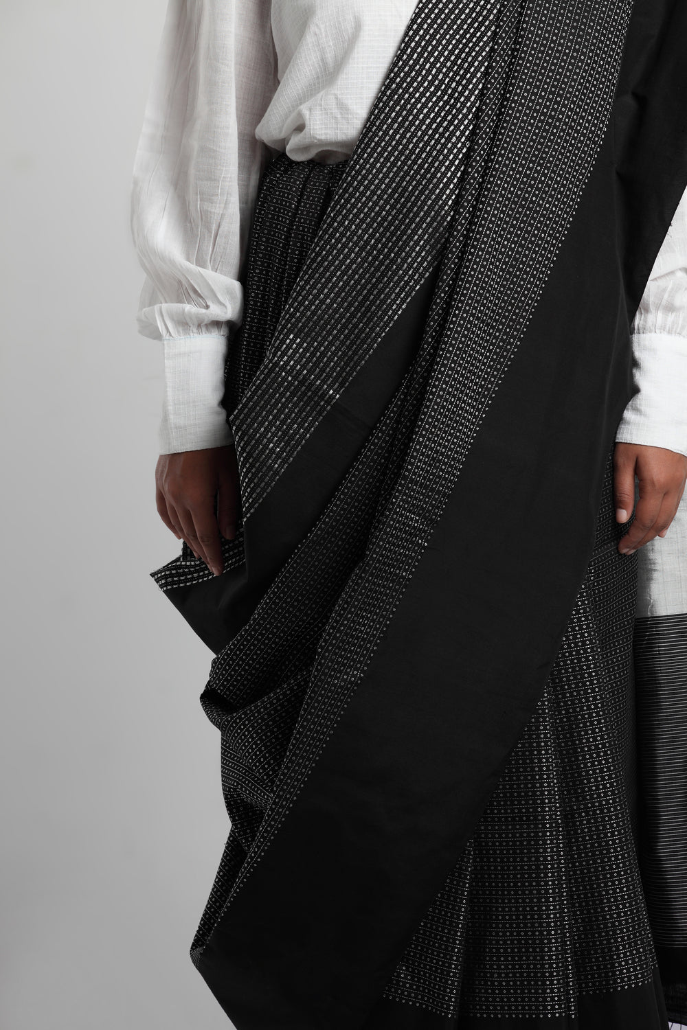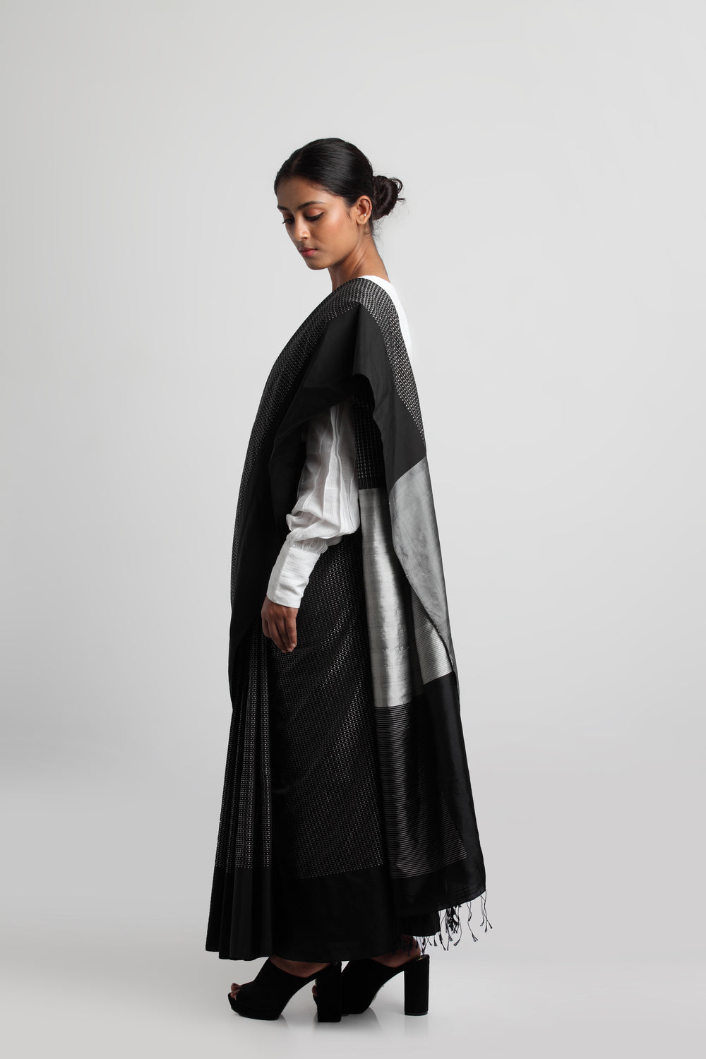 Putani saree is a testament to timeless craftsmanship and a celebration of heritage. Featuring a black body with traditional putani motifs in silver, inspired by roasted gram and a lustrous grey black silk pallu. It reimagines the classic Khana (Khun) into a contemporary saree in elegant monochrome.