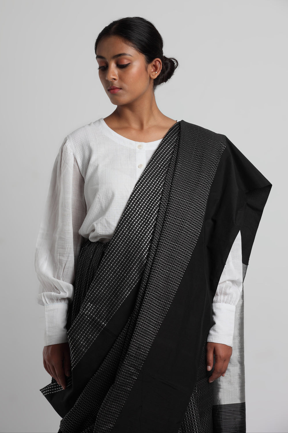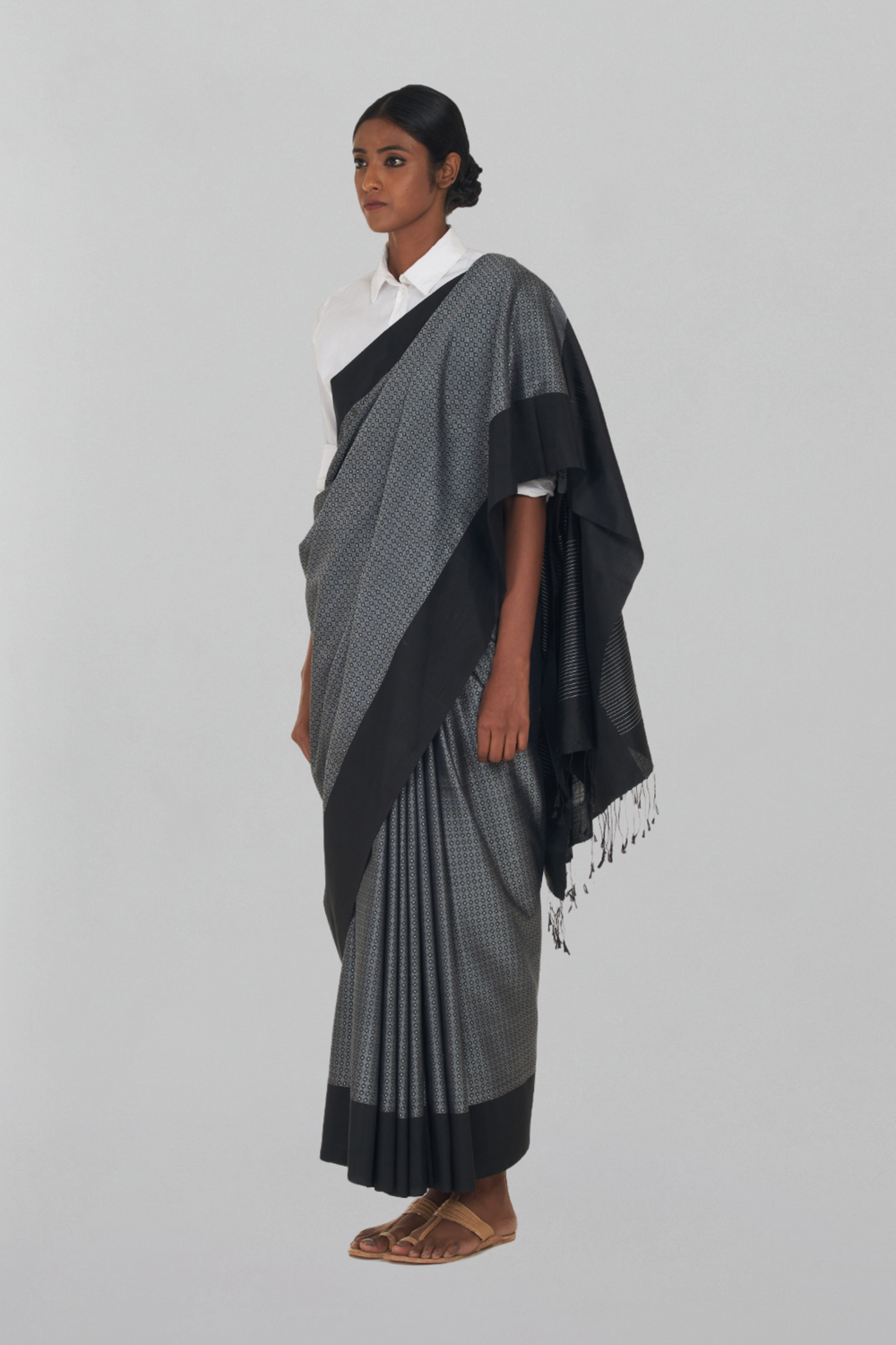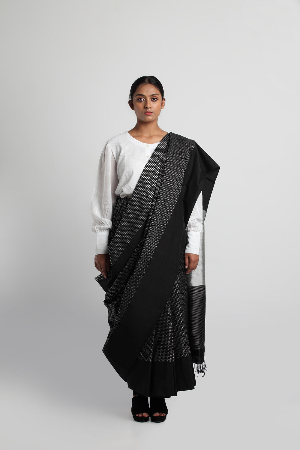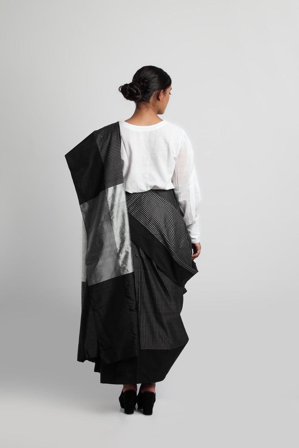 Putani saree is a testament to timeless craftsmanship and a celebration of heritage. Featuring a black body with traditional putani motifs in silver, inspired by roasted gram and a lustrous grey black silk pallu. It reimagines the classic Khana (Khun) into a contemporary saree in elegant monochrome.