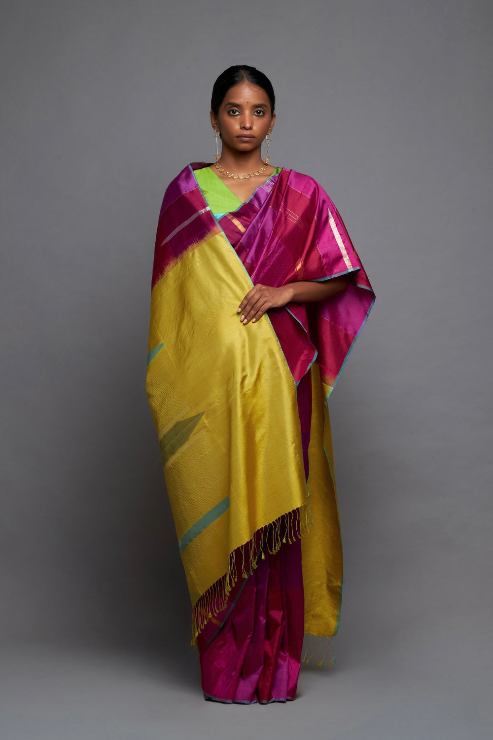 Rani ilkal saree is handwoven features an amalgamation of shades red and pinks in the body interspersed with Tiruki and lattiguni motifs in 3 shuttle weaving. The stunning Yellow green pallu features graphic circle woven with the tirukis and lattigunis.