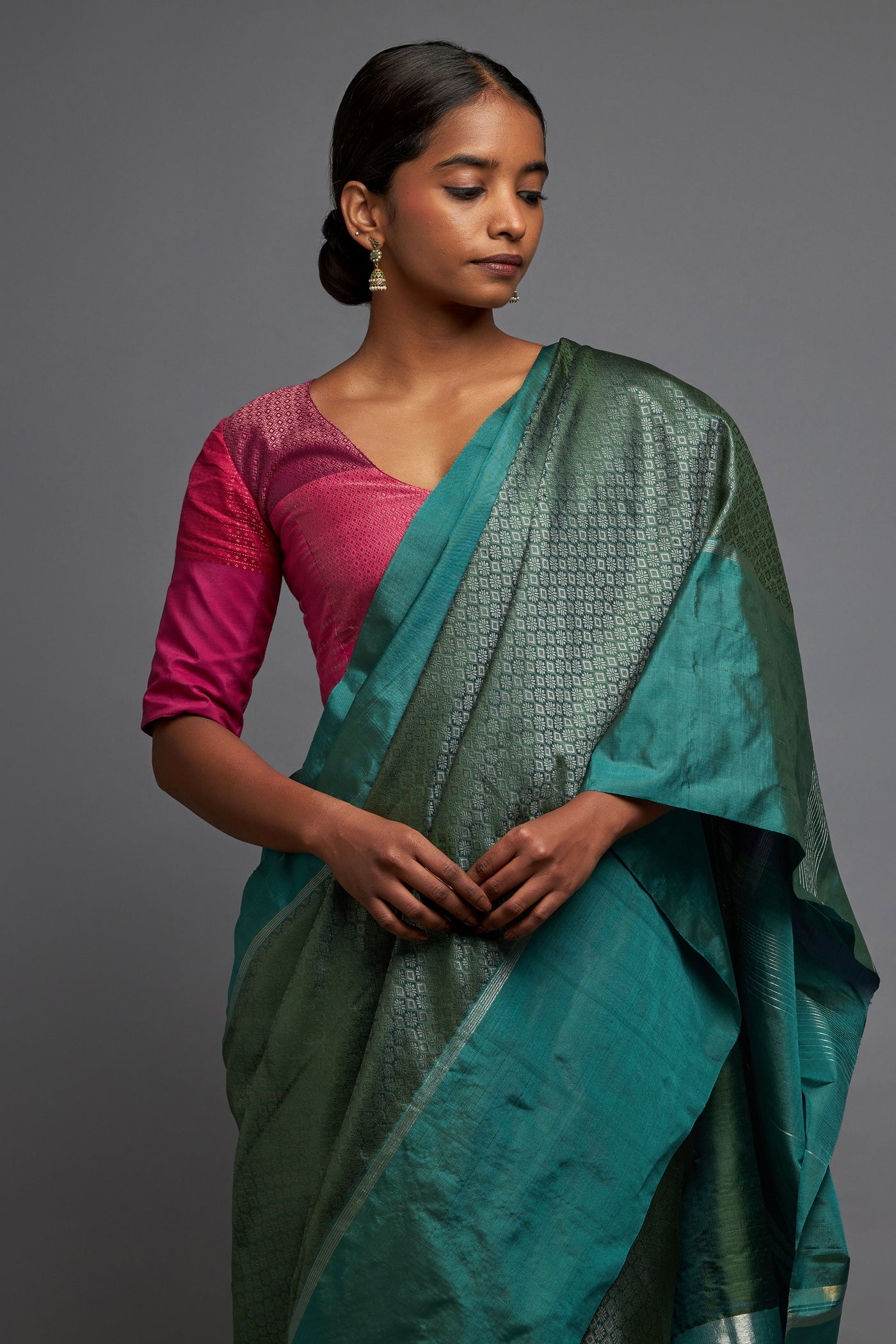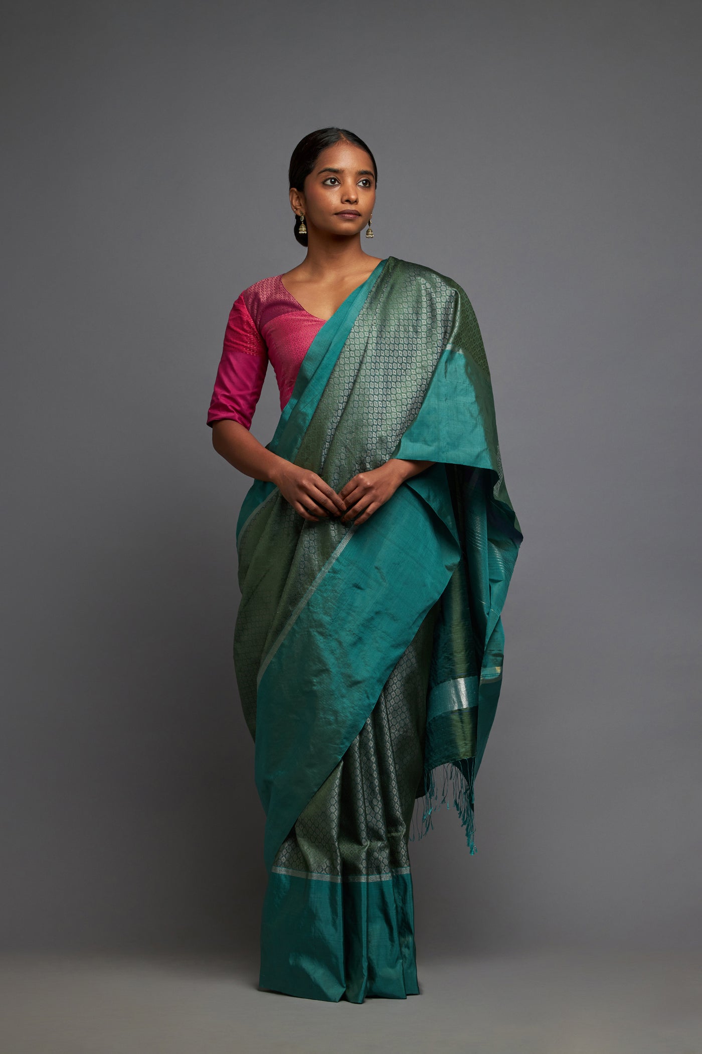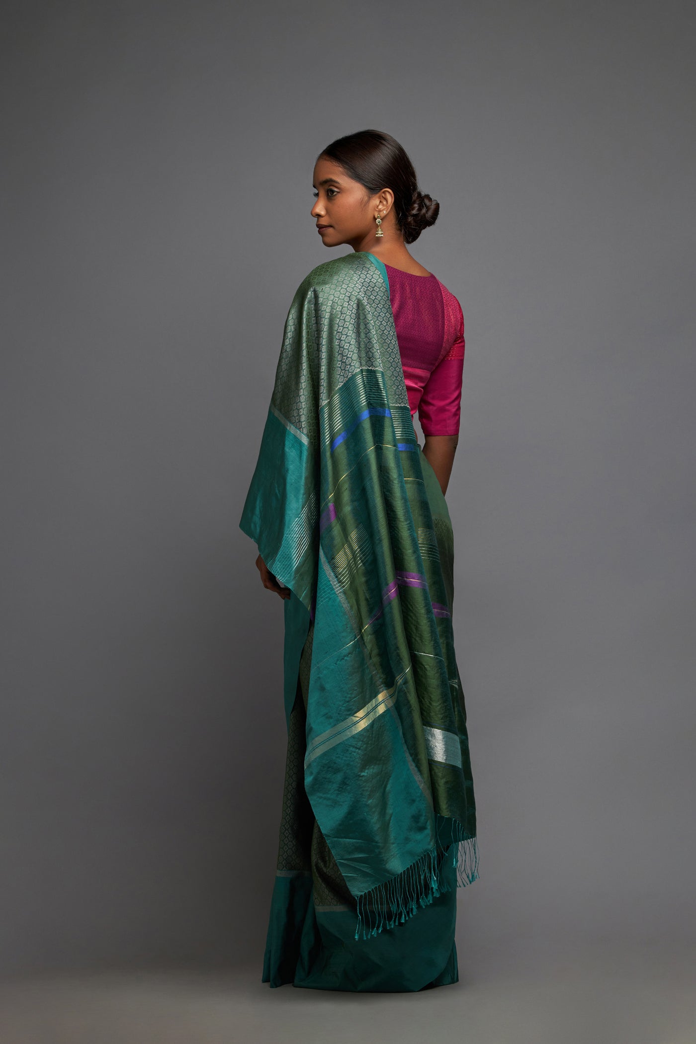 This exquisite kappu khana saree brings together the Khana and Ilkal elements on a black ground with dramatic silver and copper zari in a geometric pattern creating the most elegant drape. Reimagined khana and Ilkal woven in northern Karnataka.
