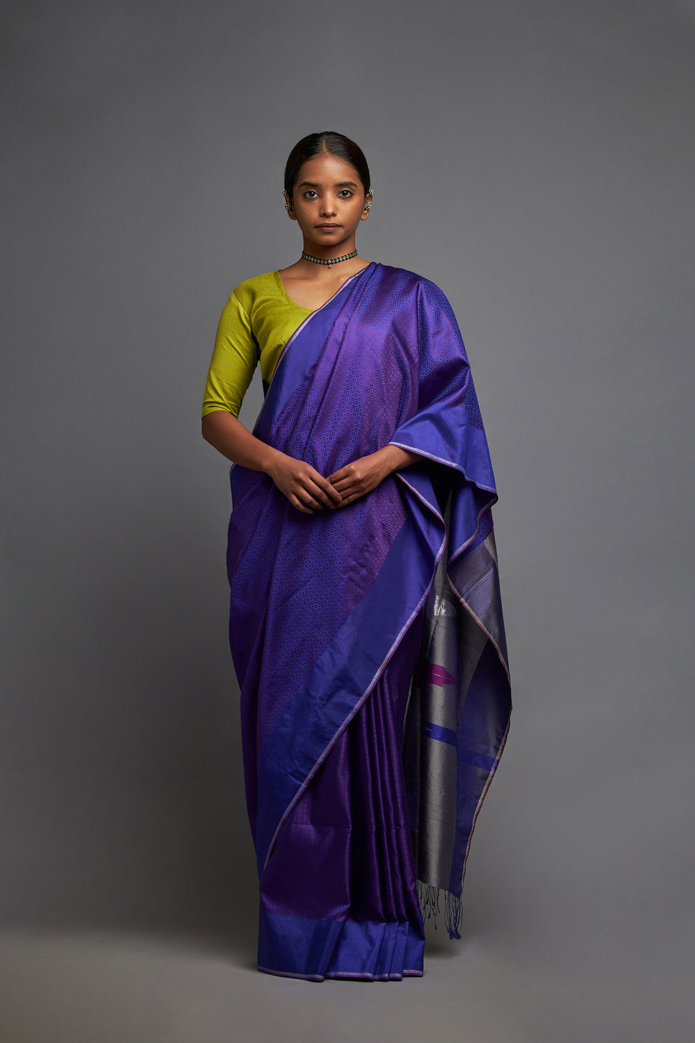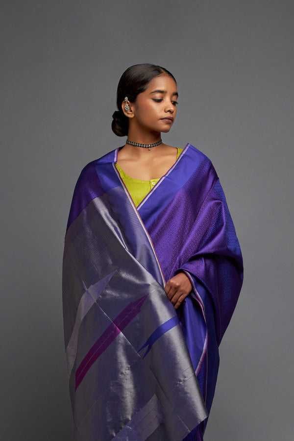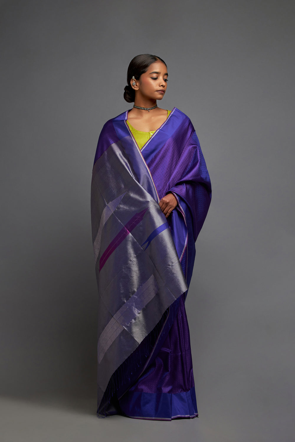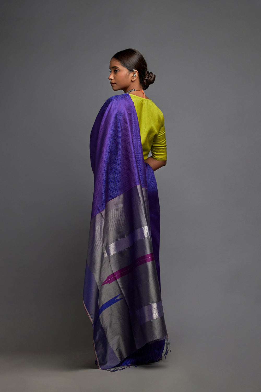 Handwoven with luxurious 100% mulberry silk, it features a vibrant purple body adorned with intricate ane hejje motifs, inspired by the graceful footprints of elephants. The grey pallu of the saree has an interplay of lattiguni motifs and tirukis in zari. This saree beautifully reimagines timeless heritage for the modern celebration.
